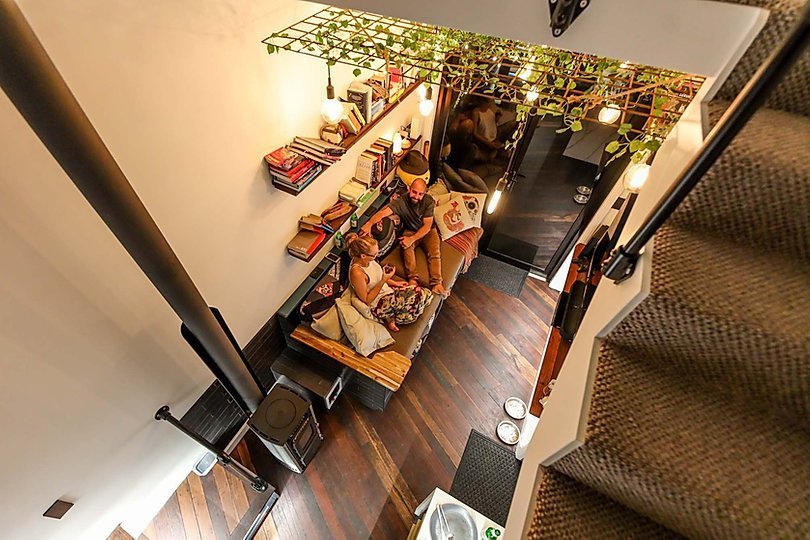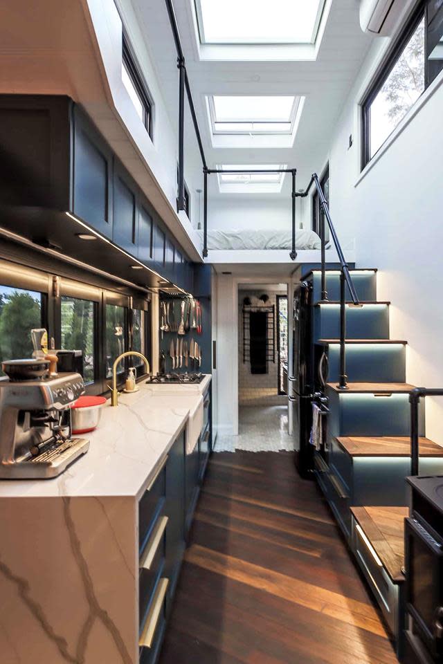 Obejmuje otwarty salon ze sklepionymi sufitami i kominkiem gazowym. W kuchni znajduje się wyspa i miejsce do siedzenia w barze śniadaniowym.